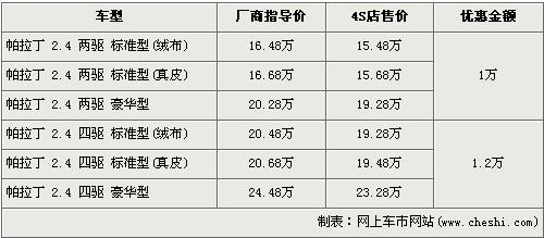 據(jù)4s店銷(xiāo)售人員介紹,帕拉丁兩驅(qū)車(chē)型的優(yōu)惠金額為1萬(wàn)元,四驅(qū)車(chē)型的優(yōu)惠金額為1.2萬(wàn)元。帕拉丁排量為2.4L,車(chē)系分為前置后驅(qū)和前置四驅(qū)兩種驅(qū)動(dòng)形式,每種驅(qū)動(dòng)形式中又分為標(biāo)準(zhǔn)版及豪華版,標(biāo)準(zhǔn)版分為絨布座椅或真皮座椅。絨布座椅全系最低配的帕拉丁 2.4兩驅(qū)標(biāo)準(zhǔn)版經(jīng)優(yōu)惠后售價(jià)降為15.48萬(wàn)元,而操縱性能更加穩(wěn)健,全系最高配的帕拉丁 2.4四驅(qū)豪華版經(jīng)優(yōu)惠后售價(jià)也降到了23.28萬(wàn)元。目前帕拉丁兩驅(qū)與四驅(qū)的豪華車(chē)型均無(wú)現(xiàn)車(chē),欲購(gòu)買(mǎi)的消費(fèi)者需交訂金1萬(wàn)元,兩周后可提車(chē)。