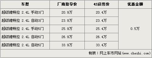 據(jù)4s店銷(xiāo)售人員介紹,目前店內(nèi)銷(xiāo)售的新超級(jí)維特拉全系優(yōu)惠5000元。低配的3門(mén)版2.4L 5速手動(dòng)車(chē)型最低售價(jià)降為20.4萬(wàn)元,而排量稍大采用5速自動(dòng)變速器的5門(mén)版3.2L車(chē)型經(jīng)優(yōu)惠后售價(jià)也降為33.4萬(wàn)元,是全系最高價(jià)。店內(nèi)現(xiàn)車(chē)顏色方面,新超級(jí)維特拉有黑、灰、白三個(gè)顏色供消費(fèi)者選購(gòu)。