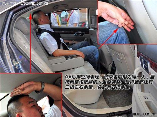 對(duì)于這種大尺寸車(chē)型最慣性的思路是感受它的空間。G6前排坐進(jìn)180cm以上乘客時(shí),頭部還有一拳以上余量。同一個(gè)人體驗(yàn)后排,腿部三指、頭部四指的空間余量只能說(shuō)比較一般。