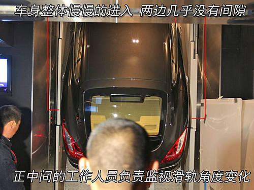 再快將車身完全吊起之前,一直都由一名工作人員監(jiān)視著滑軌和運輸架的動作,并監(jiān)控著車身與電梯兩側的距離?粗嚿砺耐耆M入電梯內,想必工作人員的心都在逐漸放松吧。