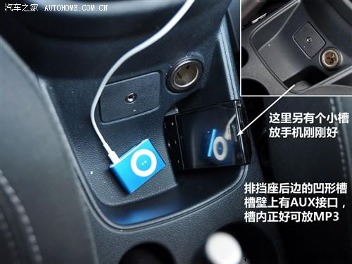 排擋座的后面是一個凹槽,槽壁上是AUX接口和電源。如果接MP3就剛好可以把播放器放在這個槽內(nèi),很方便。另外,右邊還有一個更深的槽,恰好是一個手機的寬度,放進去一試果然非常合適;蛘甙袽P3放在深槽里,淺槽內(nèi)還能放些零錢票據(jù)之類的也不錯。
