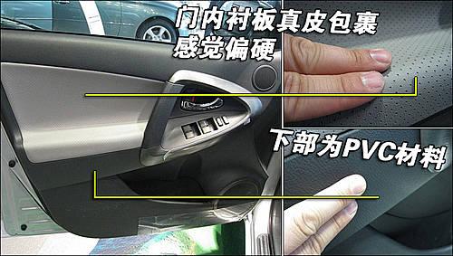 門內(nèi)扶手為皮革包裹,但感覺偏硬。門內(nèi)襯板為塑料材質(zhì)。