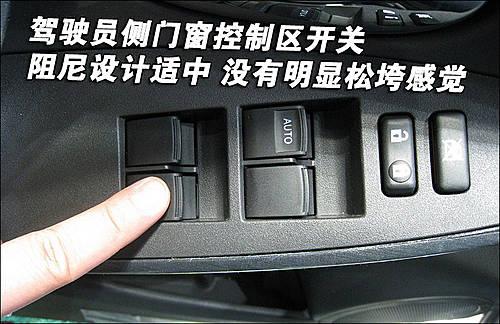 駕駛員側(cè)車門控制區(qū)集成了門窗以及中央門鎖控制鍵,整體做工十分細(xì)致,間隙均勻。使用時(shí)發(fā)現(xiàn)各按鍵的阻力適中,沒有明顯松垮的感覺。