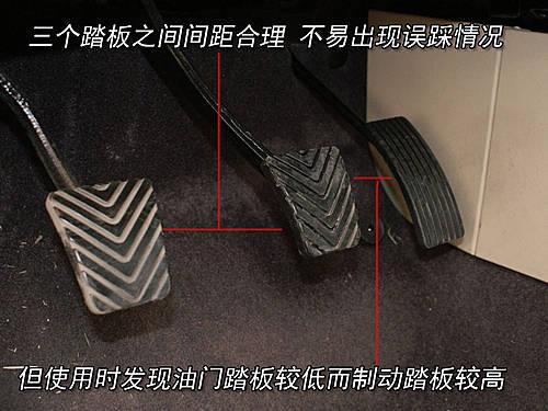 油門以及各個踏板設(shè)計的間距較大,不用擔心誤踏情況的發(fā)生。實際使用過程中發(fā)現(xiàn)各個踏板的高度并不統(tǒng)一,這點需要慢慢的適應。