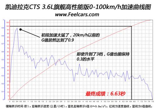 通過(guò)下面的曲線圖可以看出,新CTS的初段加速非常猛,20km/h以前的G值達(dá)到了0.9G,而即使變速器升到了3檔,G值也能保持0.3G的水平。