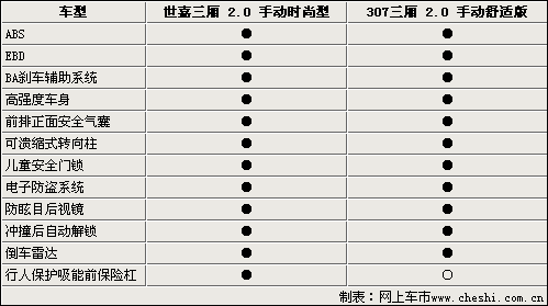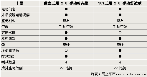 由于兩款車型都是2.0的低配車型,所以在配置方面沒有太突出的地方。電動(dòng)門窗、外后鏡電動(dòng)調(diào)節(jié)、遙控鑰匙和后排座椅放倒功能都是它們的標(biāo)配。但是兩款車型還是各自都有各自的特點(diǎn),雪鐵龍世嘉三廂配備了定速巡航,可以大大減少駕駛員長途駕駛的疲勞。標(biāo)致307則配備了具有冷藏儲(chǔ)物功能的手套箱。這些配置在同級(jí)別同價(jià)位的車型中都是很少見到的。