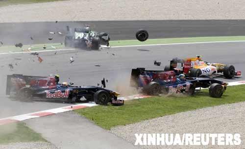 5月10日,紅牛二隊車手布爾代(前中)和隊友布埃米(前左)以及印度力量車隊車手蘇蒂爾(后)、雷諾車隊車手皮蓋駕駛的賽車發(fā)生碰撞。當(dāng)日,F(xiàn)1西班牙大獎賽落幕,布朗GP車隊的英國車手巴頓奪得冠軍。新華社/路透