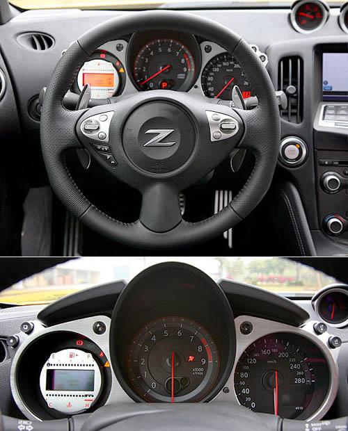 不過(guò)370Z與350Z車室仍有相當(dāng)程度的差別。首先就方向盤,370Z已換上日產(chǎn)新一代的三幅式方向盤,與英菲尼迪新一代FX的三幅式方向盤相同,方向盤上整合了音響系統(tǒng)、定速巡航系統(tǒng)和藍(lán)牙通訊等多功能按鍵;而其后兩片鎂合金制作的方向盤換檔撥片,同樣讓人愛(ài)不釋手。