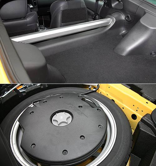 在雙門跑車的弱項(xiàng)的載物能力上,370Z也有不小幅度的提升。掀起掀背尾門,過去350Z橫貫其中的后懸吊拉桿已看不到了;370Z提供較為完整的行李廂空間,金屬拉桿則前移至行李廂邊緣,在提供車體剛性的同時(shí),降低對(duì)于置物空間的干擾。
