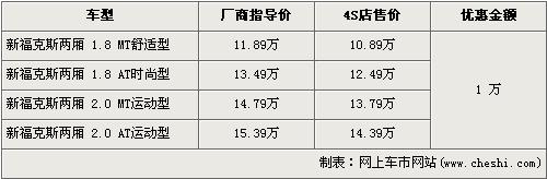 據(jù)長安福特經(jīng)銷商處銷售人員介紹,兩廂新款?怂谷祪(yōu)惠1萬元。兩廂新款?怂狗譃1.8L和2.0L兩種排量,入門級車型的1.8L手動舒適版經(jīng)優(yōu)惠后,售價為10.89萬元。高配的2.0L自動運(yùn)動版售價降到了14.39萬元。