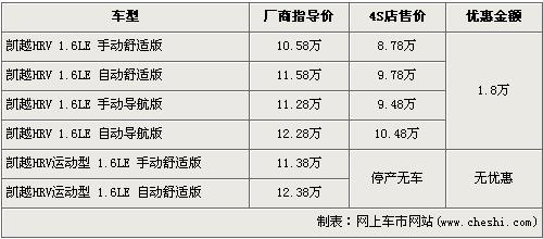 據(jù)經(jīng)銷商處銷售人員介紹,凱越HRV共有6個車型,由于運(yùn)動版車型現(xiàn)已停產(chǎn),經(jīng)銷店內(nèi)已經(jīng)沒有現(xiàn)車,所以在售的車型只有舒適版和導(dǎo)航版共4款車型。近期購買凱越HRV的消費(fèi)者可以得到1.8萬元的現(xiàn)金優(yōu)惠,經(jīng)優(yōu)惠后,入門級的1.6LE 手動舒適版車型售價從廠商指導(dǎo)價10.58萬元跌至8.78萬元。