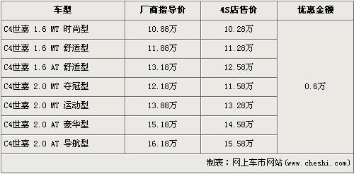 據(jù)經(jīng)銷商處銷售人員介紹,C4世嘉全系優(yōu)惠金額6000元。目前,C4世嘉全系最低配的1.6L手動時尚型售價從原廠商指導(dǎo)價10.88萬元降至10.28萬元,黑內(nèi)飾的2.0L手動運(yùn)動型售價也降至到了13.28萬元。銷售人員還介紹,目前店內(nèi)現(xiàn)車以銀色、紅色為主。