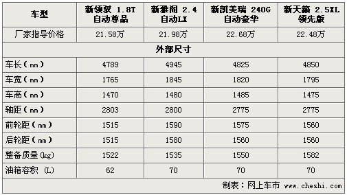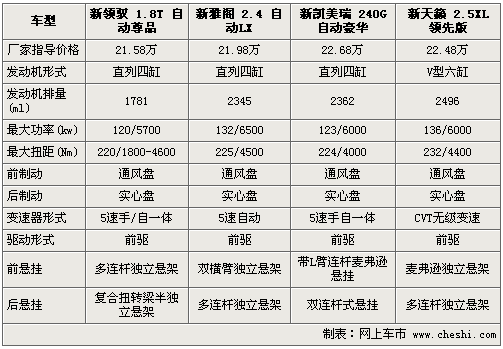 新領馭全系7款車型已于上月底正式上市,售價為16.98-30.38萬元。除前臉和尾部的全新設計外,老款1.8T引擎經(jīng)過重新調(diào)教最大功率達120Kw。而在此中級車細分市場中,新雅閣、新凱美瑞和新天籟均占據(jù)著一定的市場份額。下面通過對四款價格相近車型進行詳實解析,以便為您的購車提供一定的參考。