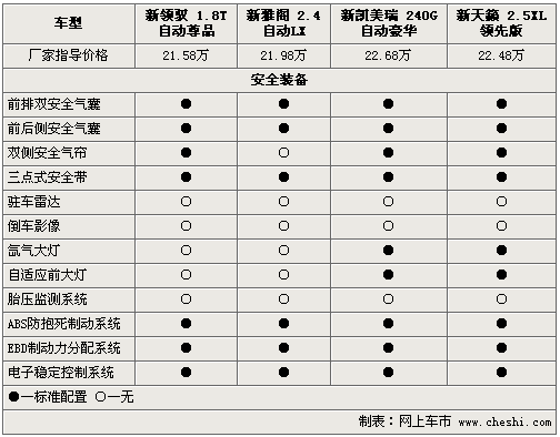 新領(lǐng)馭、新雅閣、新凱美瑞和新天籟作為中級(jí)車(chē)標(biāo)桿,其在安全性能方面可謂是下足了功夫。前排安全氣囊、側(cè)安全氣囊及電子穩(wěn)定程序等均成為四款車(chē)的標(biāo)準(zhǔn)配置。而新凱美瑞和新天籟配備了自適應(yīng)氙氣大燈,較其它兩款車(chē)提升了夜間行駛安全性。除此之外,新雅閣是四款同級(jí)車(chē)型中唯一沒(méi)有配備側(cè)氣簾的車(chē)型,讓人略感遺憾。