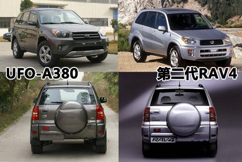 同樣這么做的還有永源UFO-A380,光聽著UFO和A380的威名就已經(jīng)讓人印象深刻了,一看外觀,號稱“用飛機的技術”研制出來的UFO-A380赤裸裸地照搬了第二代豐田RAV4,逼得豐田只好在國內(nèi)直接投產(chǎn)第三代RAV4。
