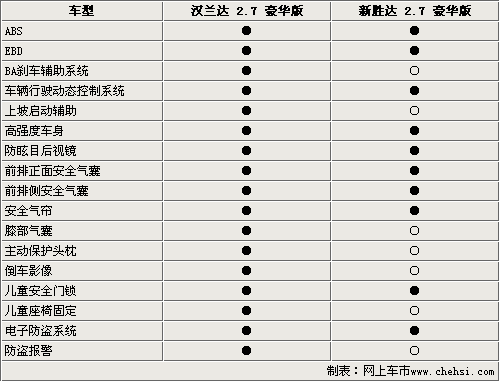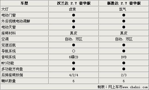 國產漢蘭達2.7豪華版和新勝達2.7豪華版的舒適配置可謂是應有盡有,電動天窗、真皮座椅、自動空調、定速巡航、多功能方向盤等設備都成為了標準配置。新勝達配備了導航系統(tǒng)和DVD影音系統(tǒng),而漢蘭達豪華版的這兩項項配置均為選配。在后排放倒比例上,漢蘭達最為靈活多變,放倒比例達到了4:2:4,可以更加有效的方便乘客置放大件物品,新勝達后排座椅只可以按2:3的比例進行放倒。