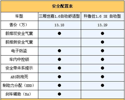 從上面表中我們看出,科魯茲在被動安全配備上更出色,除了正面雙氣囊外還配備了側(cè)面安全氣囊,當車輛發(fā)生側(cè)面碰撞時對駕乘者的保護要更到位。相比之下三廂世嘉只在更高的豪華型中配備了側(cè)氣囊,不過三廂世嘉的主動安全方面卻比較完備,ABS+EBD+BA的組合完全可以應付日常緊急情況,而科魯茲相對來說就有些單薄,甚至在當前經(jīng)濟型轎車都要配備剎車輔助系統(tǒng)的情形下,這項配備的缺失不能不說是一種遺憾!