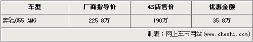根據(jù)北京奔馳4S店銷售人員介紹,目前奔馳G55 AMG現(xiàn)金優(yōu)惠35.8萬元。經(jīng)優(yōu)惠后,奔馳G55 AMG售價(jià)從廠商指導(dǎo)價(jià)的225.8萬元下降到了190萬元。銷售人員還介紹,目前店內(nèi)無奔馳G55 AMG現(xiàn)車,欲購(gòu)此車的消費(fèi)者需交訂金10萬元,最早2個(gè)禮拜可提車。