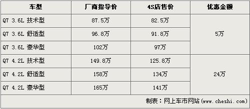 據(jù)經(jīng)銷商銷售人員介紹,奧迪Q7分為3.6L和4.2L兩種排量共7款車型,目前全系最高優(yōu)惠為25萬元現(xiàn)金。3.6L車型優(yōu)惠5萬元,優(yōu)惠后售價(jià)分別為:技術(shù)型82.5萬元,舒適型91.8萬元,豪華型97萬。排量更大的4.2L車型優(yōu)惠更是達(dá)到了24萬元,優(yōu)惠后售價(jià)分別為技術(shù)型125.8萬元,舒適型134萬元,豪華型141萬元。