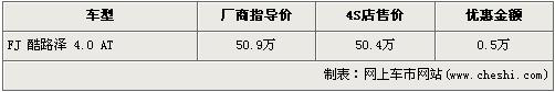 據(jù)廣州豐田4S店銷售人員表示,F(xiàn)J酷路澤已經(jīng)停止了進口目前在售的都是庫存貨,目前FJ酷路澤有5000元的優(yōu)惠,前段時間的3萬元優(yōu)惠已不復(fù)存在。經(jīng)優(yōu)惠后,F(xiàn)J酷路澤的售價從原廠商指導(dǎo)價50.9萬元下降到了50.4萬元。銷售人員還介紹,目前FJ酷路澤現(xiàn)車不多,多處商家已無現(xiàn)車,其顏色主要以黃色居多,欲購買者應(yīng)快快出手。