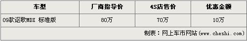 據(jù)經(jīng)銷商銷售人員介紹,09款謳歌-MDX的現(xiàn)金優(yōu)惠10萬元,優(yōu)惠后售價也從原廠商售價80萬降到了70萬。銷售人員還介紹,09款謳歌MDX增加的實用性的配件包括前下護板和后下護板,能避免惡劣路況對底盤帶來的損傷,并且09款謳歌MDX還新增了巴厘海藍和摩卡褐金兩種顏色,店內(nèi)現(xiàn)車非常充足,顏色也比較全,欲購買者挑選的空間非常大。
