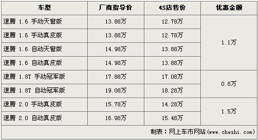 據(jù)北京一汽大眾經(jīng)銷店銷售人員介紹,在上海車展上亮相的速騰1.4TSI最早預(yù)計將在6月上市銷售,預(yù)售價格可能不會低于16萬元,此車的上市將會取代目前在售的速騰2.0升自動擋車型。近期購買速騰在售車型的消費者都可以得到不同程度的優(yōu)惠,速騰1.6L車型優(yōu)惠1.1萬元,1.8T冠軍版車型優(yōu)惠8000元,2.0L車型優(yōu)惠金額達(dá)到了全新最高的1.5萬元,但是2.0L車型目前店內(nèi)無現(xiàn)車,預(yù)購買者需交訂金1000元,約等一周后可提車。
