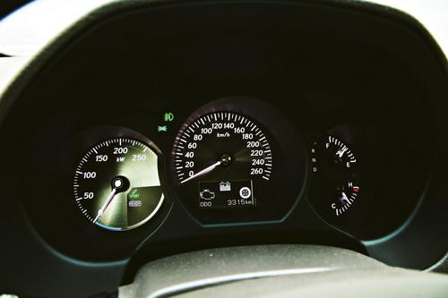 由于使用了電動機系統(tǒng),GS450h的儀表盤并沒有設(shè)置發(fā)動機轉(zhuǎn)速表,取而代之的一個功率表,隨時顯示電動機的瞬時輸出功率;至于中間的車速表和右邊的綜合信息表在所有車型上則都是一樣的。GS系列車型儀表盤另一個特點就是具有ECD電子色控裝置,能夠根據(jù)照射在儀表盤上的光線強度自動調(diào)節(jié)自身亮度,保證駕駛員能夠清晰地讀取數(shù)據(jù)——安全實用的配置。