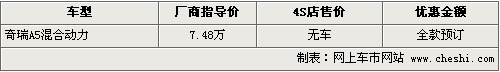 據(jù)4S店銷售人員介紹,奇瑞A5混合動力車型目前銷量很少,但仍有少量夠買者。消費(fèi)者如果購車的話需要全款訂車,這款車的售價為7.48萬元。