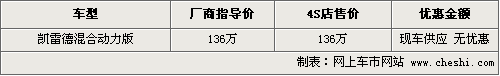 筆者從凱迪拉克北京地區(qū)經(jīng)銷商處了解到,目前凱雷德混合動(dòng)力版車型已經(jīng)到店,現(xiàn)車主要為黑色。據(jù)銷售人員介紹,混合動(dòng)力版車型只有白色和黑色兩款車,現(xiàn)在白色款還需要預(yù)訂,售價(jià)為136萬(wàn),現(xiàn)車暫無(wú)優(yōu)惠。