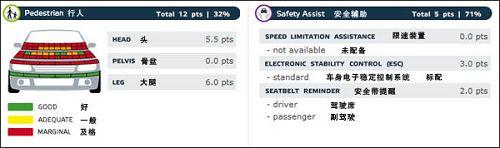 在行人安全測試中,Q5成績差強人意。引擎蓋對行人的骨盆部位防御明顯不足。僅保險杠部分相對傷害較小。在安全輔助設(shè)備得分中,Q5標(biāo)配了ESC車身電子穩(wěn)定系統(tǒng),同樣也標(biāo)配了駕駛席和副駕駛的安全帶提醒。為Q5獲得了71%的得分率。