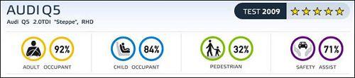 總成績,奧迪Q5在駕駛者保護上獲得92%較高的得分率,對于兒童的保護獲得84%的得分率,對于行人保護相對較低,僅獲得32%的得分率,安全輔助方面獲得71%的加分,最終獲得5星安全評價。