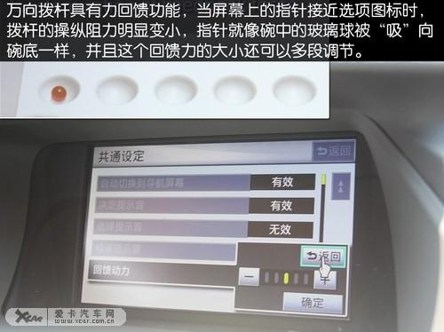 而且萬向撥桿居然有力回饋功能,當(dāng)屏幕上的指針接近選項(xiàng)圖標(biāo)時(shí),撥桿的操縱阻力明顯變小,指針就像碗中的玻璃球被“吸”向碗底一樣,并且這個(gè)回饋力的大小還可以多段調(diào)節(jié)。