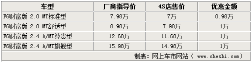 據(jù)銷售人員介紹,目前比亞迪F6財(cái)富版全系可最高優(yōu)惠萬元現(xiàn)金。在售車型涵蓋4款車型兩個(gè)排量,2.0L的兩款手動(dòng)車型以及2.4L的兩款自動(dòng)檔車型。購車同時(shí)還有部分內(nèi)外裝飾或保養(yǎng)優(yōu)惠贈送。