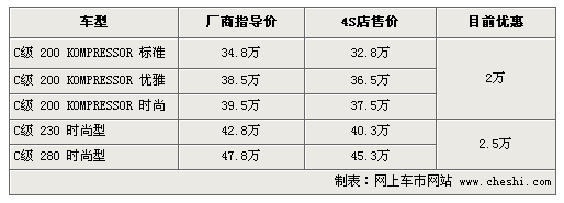 據(jù)4S店銷售人員介紹:目前奔馳C優(yōu)惠幅度較大,全系購車送全險,同時C200K優(yōu)惠達(dá)2萬元,C230、C280優(yōu)惠更是達(dá)到2.5萬元。不過目前現(xiàn)車較少,有些車型需要預(yù)訂,預(yù)定周期為1個月左右。C200K優(yōu)雅型與C230時尚型現(xiàn)車較少,C230時尚型甚至將要停產(chǎn),由于這兩款車價格與其它3款車型價格相近,并配置有些令人不滿,所以將要停止生產(chǎn)。