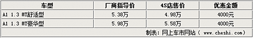 據(jù)銷售人員介紹,奇瑞A1目前可以優(yōu)惠4000元,但豪華型現(xiàn)車不足,部分顏色需要預(yù)訂。而且個別4S店的并沒有豪華型現(xiàn)車,也需要預(yù)訂,訂金為2000元。