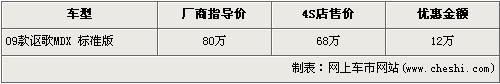 據(jù)經(jīng)銷商銷售人員介紹,09款謳歌-MDX的現(xiàn)金優(yōu)惠12萬元,優(yōu)惠后售價也從原廠商售價80萬降到了68萬,首次跌破了70萬元。銷售人員還介紹,09款謳歌MDX增加的實用性的配件包括前下護(hù)板和后下護(hù)板,能避免惡劣路況對底盤帶來的損傷,并且09款謳歌MDX還新增了巴厘海藍(lán)和摩卡褐金兩種顏色,店內(nèi)現(xiàn)車非常充足,顏色也比較全,欲購買者挑選的空間非常大。