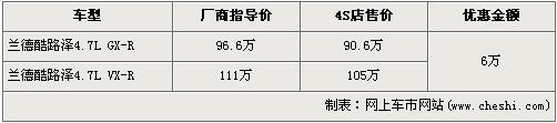 據(jù)經(jīng)銷(xiāo)商銷(xiāo)售人員介紹,豐田-蘭德酷路澤分為4.0L和4.7L兩種排量,由于4.0L車(chē)型的尾氣排放是歐III標(biāo)準(zhǔn),沒(méi)有達(dá)到北京施行的歐IV標(biāo)準(zhǔn),所以北京限賣(mài),店內(nèi)沒(méi)有4.0L車(chē)型。4.7L車(chē)型分為GX-R版和VX-R版,目前購(gòu)買(mǎi)蘭德酷路澤的消費(fèi)者可以得到6萬(wàn)元的優(yōu)惠。經(jīng)優(yōu)惠后,GX-R版售價(jià)降為了90.6萬(wàn)元,VX-R版售價(jià)降到了105萬(wàn)元。銷(xiāo)售人員還介紹,店內(nèi)沒(méi)有蘭德酷路澤現(xiàn)車(chē),預(yù)購(gòu)買(mǎi)者需交訂金1萬(wàn)元,約等一個(gè)半月可提車(chē)。