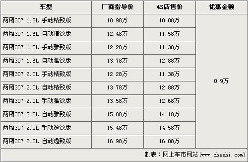 據(jù)東風(fēng)標(biāo)致經(jīng)銷店銷售人員介紹,兩廂標(biāo)致307分為1.6L和2.0L兩種排量,目前全系優(yōu)惠9000元,入門車型的1.6L 手動(dòng)精致版原廠商指導(dǎo)價(jià)為10.98萬元,經(jīng)優(yōu)惠后僅售10.08萬元,排量稍大的2.0L排量的低配車型手動(dòng)精致版經(jīng)優(yōu)惠后售價(jià)為11.38萬元。