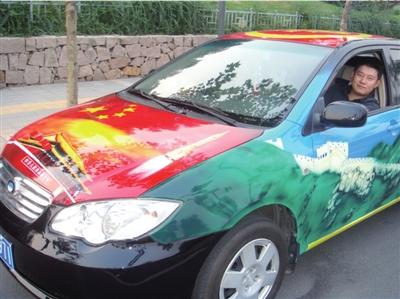“前機(jī)蓋是巨幅的天安門城樓,車身兩側(cè)是鳥巢和長城,在車的頂上,則是60年大慶的圖標(biāo)!睘橄驀鴳c獻(xiàn)禮,家住天安門附近的林先生和朋友一起在自己的愛車上做了一系列的彩繪,表達(dá)對祖國的祝福。