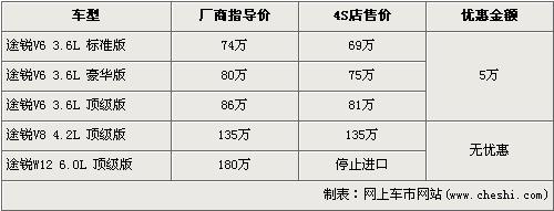 據(jù)經(jīng)銷商銷售人員介紹,途銳的旗艦車型W12缸的6.0L頂配型已經(jīng)停止進口。而3.6L的車型有5萬元的優(yōu)惠,最低配的3.6L標準型的售價從74萬元下跌到了69萬元,首次跌破了70萬元。4.2L頂級版由于店內(nèi)沒有現(xiàn)車所以沒有優(yōu)惠,欲購買的消費者需交訂金10萬元,約等2個月才可提車。