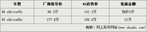 據(jù)北京寶馬經(jīng)銷店銷售人員介紹,現(xiàn)在在售的X6車型分為售98.3萬元的35i車型和售價(jià)為177.8萬元的50i兩款車型。店內(nèi)沒有35i車型的現(xiàn)車,消費(fèi)者需要交訂金10萬元,待店內(nèi)到車后提現(xiàn)車還要加價(jià)3萬元,售價(jià)從98.3萬元上升到了100.3萬元,排量更大的4.4升的50i車型有21萬元的現(xiàn)金優(yōu)惠,售價(jià)降到了156.8萬元。銷售人員還介紹,50i車型現(xiàn)車店內(nèi)也不多,欲購買的消費(fèi)者需加快購買腳步。