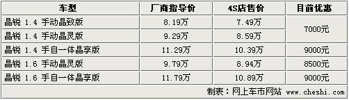 據(jù)4S店銷售人員介紹:目前晶銳全系最高優(yōu)惠達9000元,最低僅售7.49萬。晶銳目前各店內(nèi)現(xiàn)車較少,只有個別車型有現(xiàn)車,如需預定需等待1個半月時間。價格方面,如到店內(nèi)洽談可獲得更高優(yōu)惠。1.4升手動車型優(yōu)惠幅度,由原來的6000元增至7000元,而1.4升與1.6升自動擋車型已優(yōu)惠9000元,相比之前的6000元增幅達33.3%。