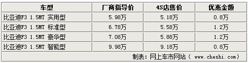 據(jù)比亞迪汽車4S店銷售人員介紹,目前比亞迪F3智能白金版只有實用型、標(biāo)準(zhǔn)型和豪華型有現(xiàn)車銷售,智能型和自動擋車型都現(xiàn)車不足,即使預(yù)訂也無法得知具體到店時間。現(xiàn)在購買比亞迪F3智能白金版可以有較大的優(yōu)惠幅度,其中標(biāo)準(zhǔn)型,豪華型可以優(yōu)惠12000元;而智能型也可以優(yōu)惠8000元,但需要預(yù)訂。該比亞迪4S店銷售人員表示,如果到店詳談,還可以有更多的優(yōu)惠幅度。