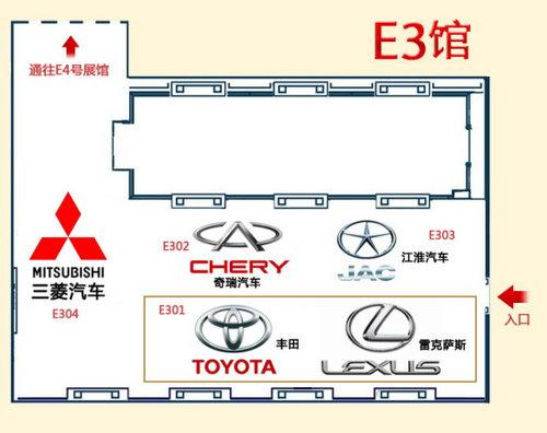 在本屆北京車展,E3館有奇瑞汽車、豐田、雷克薩斯、江淮、三菱等5個品牌參展。亮點(diǎn)車型:豐田新銳志、豐田新款卡羅拉、雷克薩斯LFA、三菱RVR、奇瑞新款A(yù)5等。