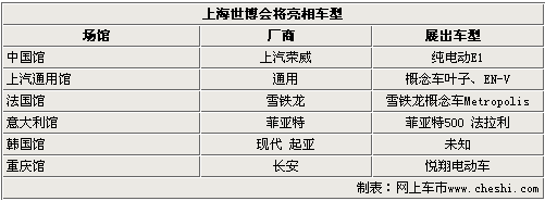 在本次世博會上,中國館中將展出上汽榮威推出的純電動車E1,這款車在本屆北京車展中已經(jīng)正式亮相,預(yù)計(jì)將在2012年正式實(shí)現(xiàn)量產(chǎn)。在通用館展出的EN-V日前已在上海以全球首發(fā)的身份亮相,由于造型不同他們分別被命名為“驕”、“妙”和“笑”。這款雙人座EN-V電動聯(lián)網(wǎng)車創(chuàng)新地融合了電氣化和車聯(lián)網(wǎng)兩大技術(shù),從而實(shí)現(xiàn)未來城市交通零油耗、零排放、零堵塞和零事故。其余將亮相的車型還包括雪鐵龍全新概念車Metropolis、菲亞特500、法拉利和長安悅翔電動車等。