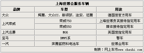 除了在展館內(nèi)展出的新車,各大汽車廠商也對組委會和場館提供了服務(wù)用車。自2008年成為北京奧運(yùn)會官方用車合作伙伴之后,大眾汽車在即將開幕的2010年上海世博會中,成為德國國家館官方用車合作伙伴,將頂級豪華轎車輝騰等6輛官方用車正式交付給上海世博會德國國家館。上汽榮威旗下的榮威750和550則成為了世博會貴賓指定用車和媒體制定用車。寶馬公司則提供的22輛530Li轎車將納入交警總隊(duì)警務(wù)開道車隊(duì),為世博會期間迎送貴賓擔(dān)負(fù)起安全保障工作。