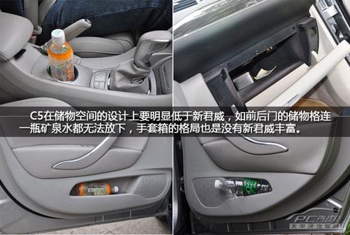 車內(nèi)儲(chǔ)物空間我們用的是“飲料瓶”來衡量看看究竟那款車更人性,新君威車內(nèi)的儲(chǔ)物空間設(shè)計(jì)相當(dāng)人性化,前后側(cè)門的儲(chǔ)物格能放進(jìn)去飲料瓶,手套箱的儲(chǔ)物格局也是很豐富,排擋前方預(yù)留了2個(gè)飲料瓶的儲(chǔ)物槽,但是中控臺(tái)上方對于票據(jù)、錢包、手機(jī)等雜物空間設(shè)計(jì)就沒有C5那么人性。