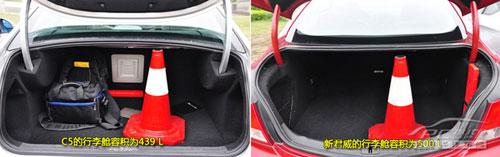 在車身尺寸方面新君威比C5車身長度和高度數(shù)據(jù)要好一些,分別多出25mm和26mm。而軸距上C5卻要長出新君威78mm,也比新君威寬了4mm,在同級車?yán)锩嬉材玫贸鍪,在?shí)際體驗(yàn)中,C5的后排頭部空間受益于內(nèi)凹處理方式以增加頭部空間,顯得很充裕,所以無論是商用還是家用空間完全夠用,腿部空間也夠用,而新君威由于軸距較短且是運(yùn)動(dòng)化的定位,后排空間表現(xiàn)并不理想,腿部空間只能說夠用,且頭部空間則略顯局促。