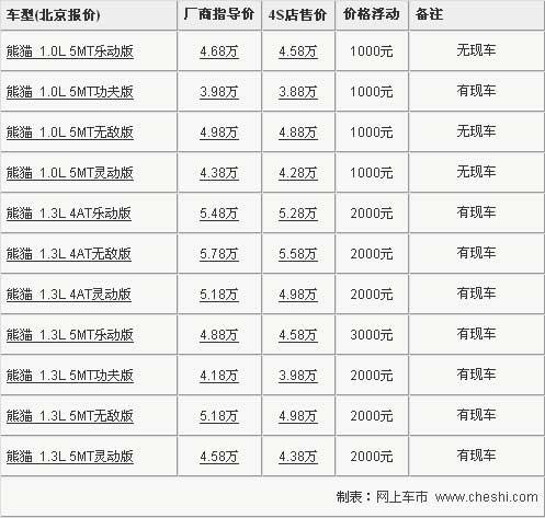 作為全球鷹旗下首款產(chǎn)品,吉利熊貓自上市以來就廣受年輕消費者的關(guān)注。很多消費者不難看出,吉利熊貓時尚靚麗的外形,與憨態(tài)可掬的熊貓非常相似,給整車帶來很多可愛的元素,符合時下年輕消費者的購車需求。網(wǎng)上車市近期走訪北京地區(qū)吉利4S店,了解到了吉利熊貓最新的市場信息,具體情況請參考下表: