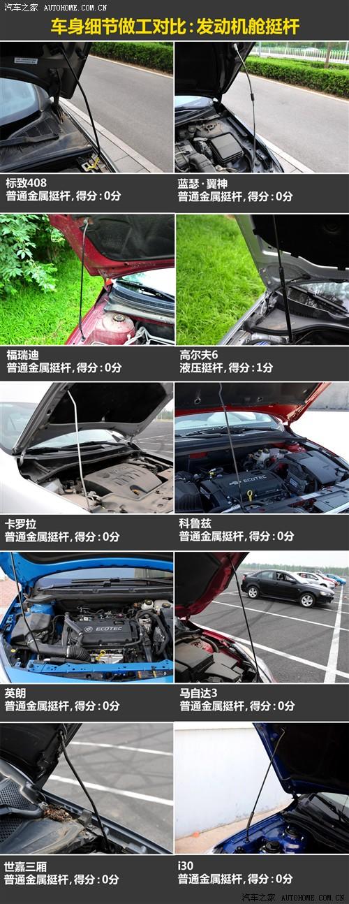 在這一環(huán)節(jié)的對比中,高爾夫6憑借著液壓的發(fā)動機艙蓋挺桿和大面積的發(fā)動機護板而保持領先,進口的馬自達3兩廂在發(fā)動機護板上也不錯,但其他一些車型其實則沒有大的區(qū)別。